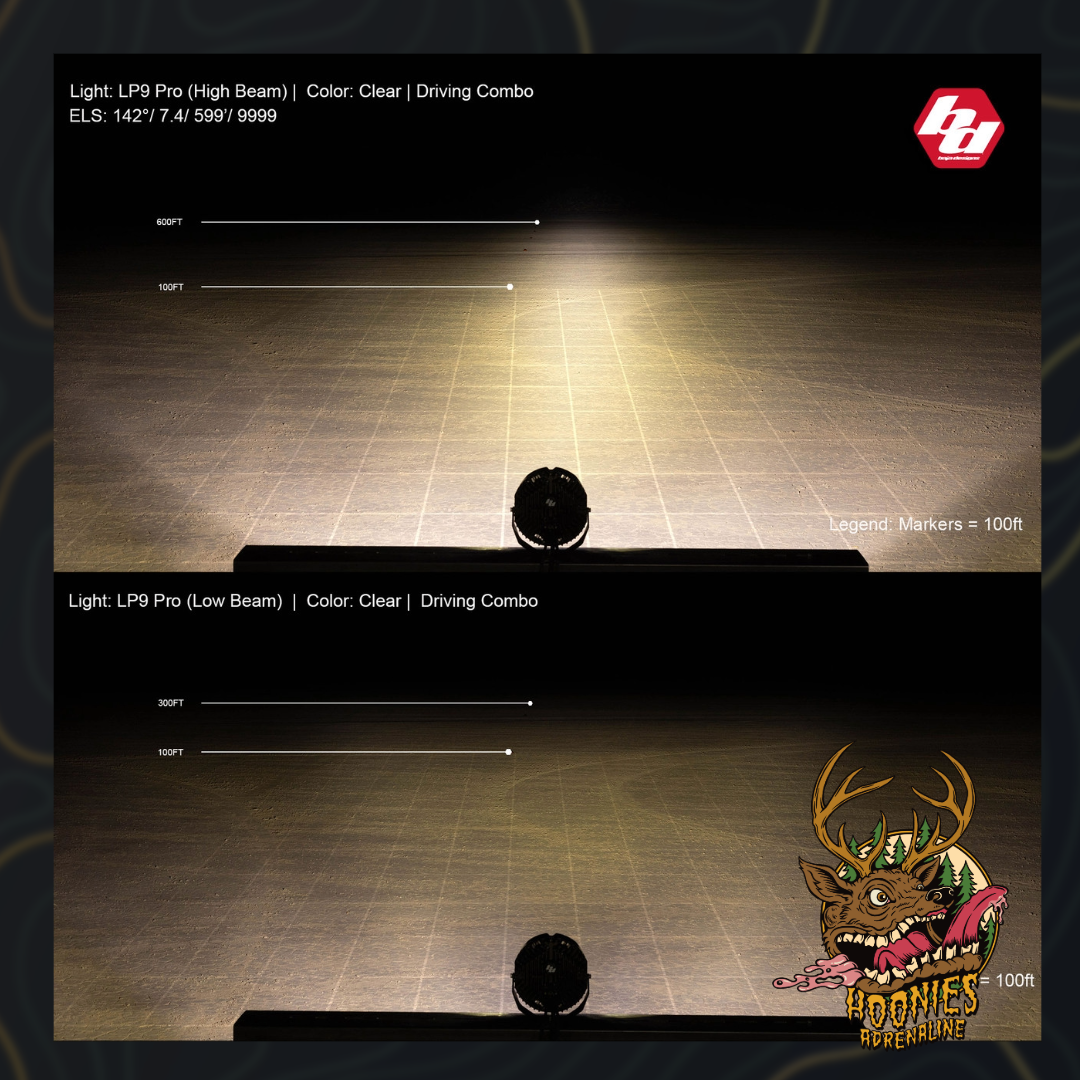 The LP9 Pro is available in multiple patterns to suit your needs. The driving/combo pattern provide maximum trail coverage in a single light. The driving/combo pattern is equipped with both driving (42 degrees) and spot (8 degrees) optics to provide you with a smooth blend of light for both near-field applications and distance (Lighting Zones, 1,2, 3). The Spot pattern is a longer and narrower 8-degree beam focus for illumination further down the trail or road (Lighting Zone 4 & 5) and is designed to be used in conjunction with additional wide cornering and/or driving/combo auxiliary lights.